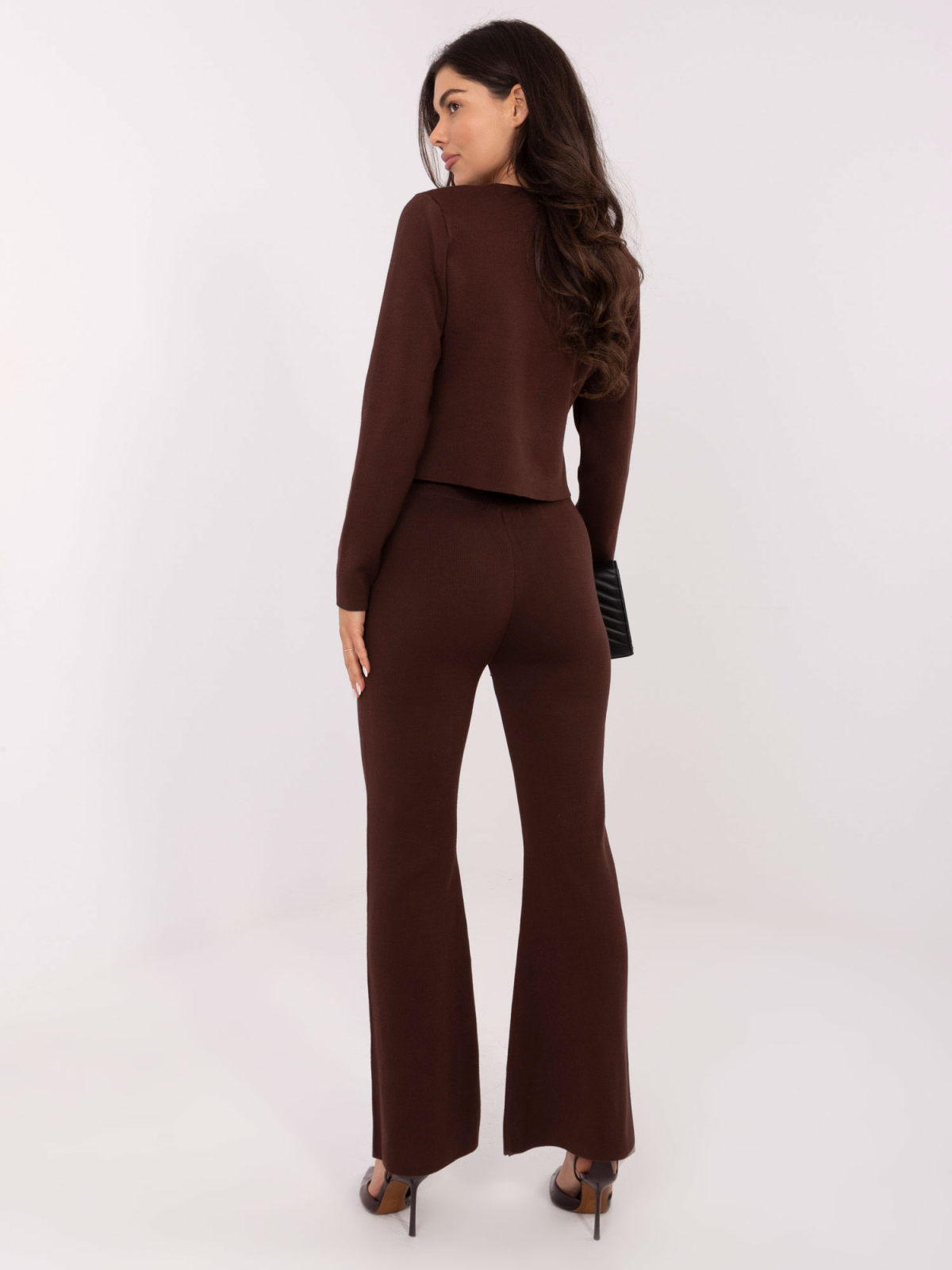 Set din tricot, format din cardigan cu nasturi și pantaloni lungi cu croi evazat. Materialul moale, cu proporție ridicată de viscoză, oferă o cădere frumoasă, elasticitate și confort pe tot parcursul zilei.