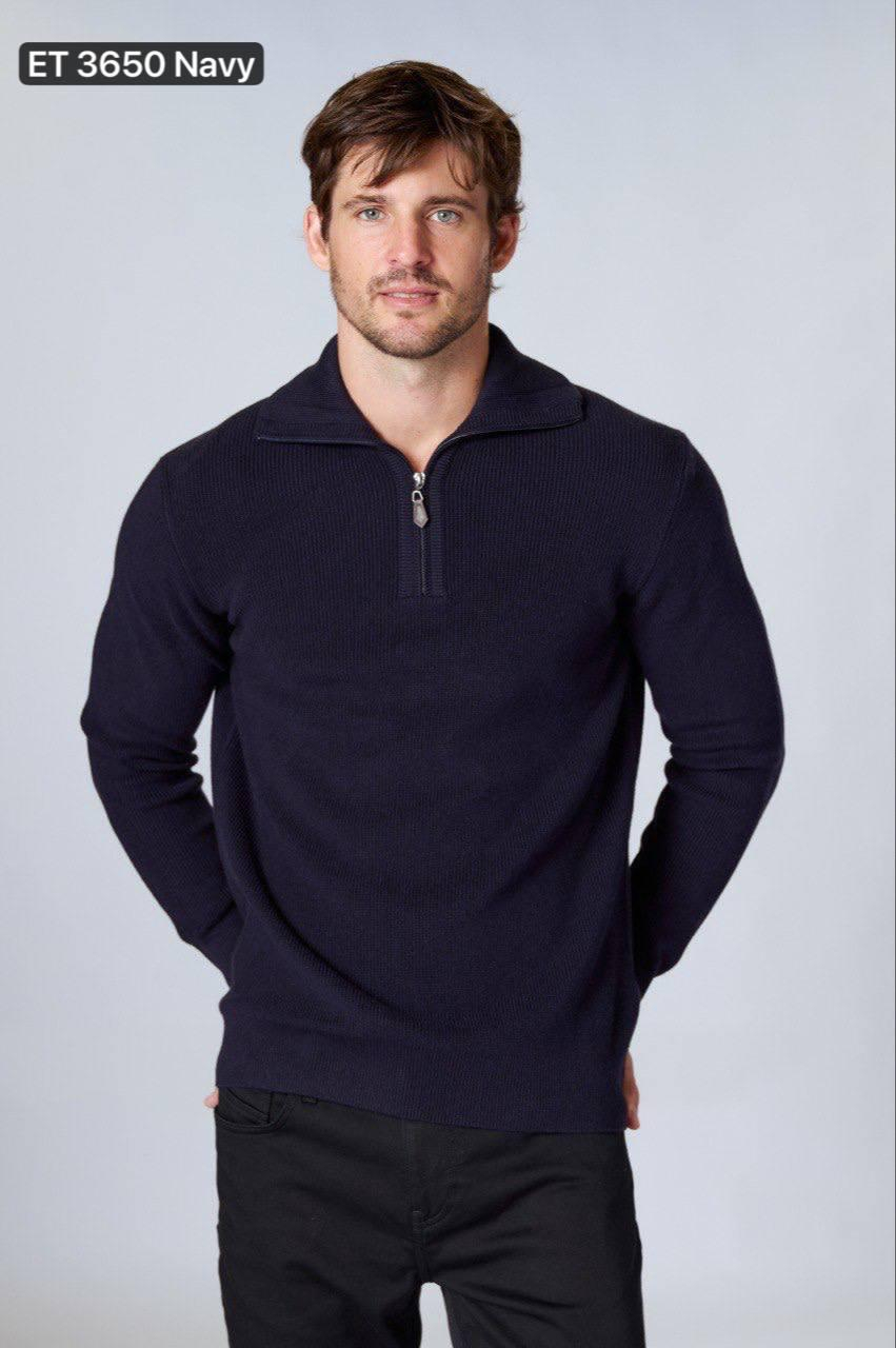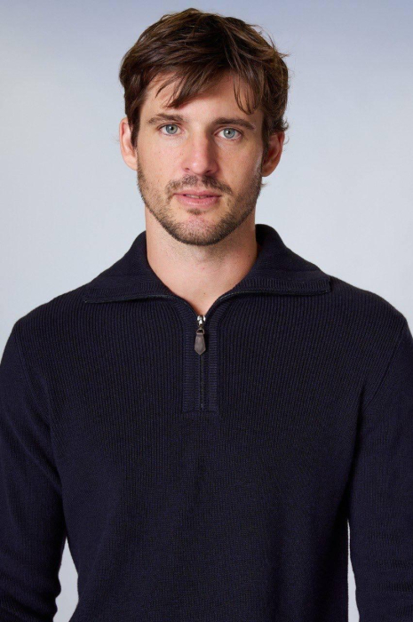 Pulover bărbătesc cu fermoar scurt la guler, realizat într-o nuanță clasică de bleumarin (navy), ideal pentru ținute casual sau smart-casual.