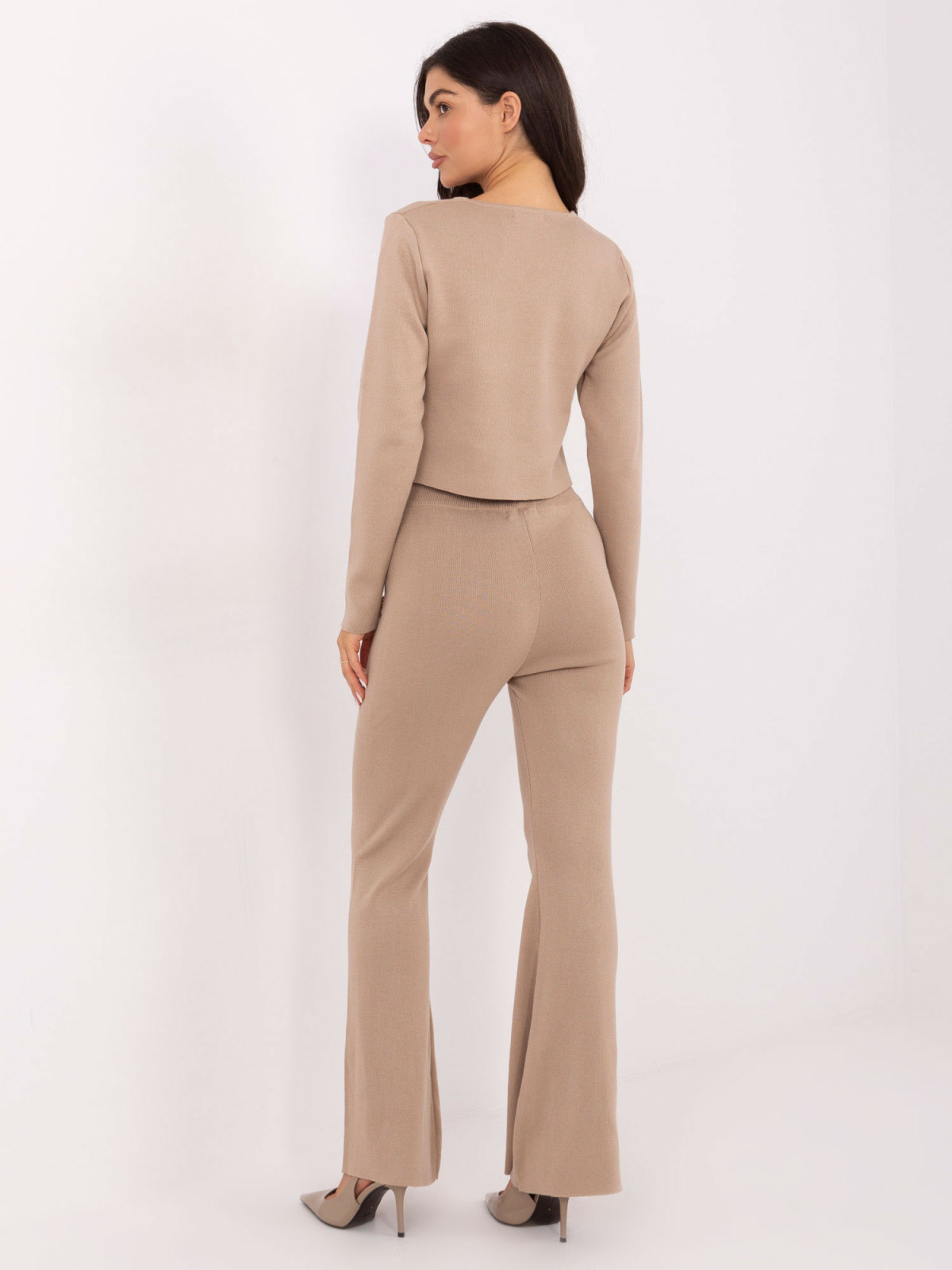 Set din tricot, format din cardigan cu nasturi și pantaloni lungi cu croi evazat. Materialul moale, cu proporție ridicată de viscoză, oferă o cădere frumoasă, elasticitate și confort pe tot parcursul zilei.